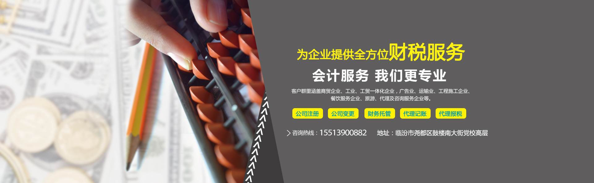山西華夏智誠(chéng)企業(yè)管理咨詢(xún)有限公司創(chuàng)立于2017年, 是為企業(yè)提供*********財(cái)稅服務(wù)的專(zhuān)業(yè)服務(wù)平臺(tái)。本著“誠(chéng)信為本,服務(wù)至上”的企業(yè)理念,有著專(zhuān)業(yè)精深的專(zhuān)業(yè)水平和豐富經(jīng)驗(yàn),為企業(yè)進(jìn)行會(huì)計(jì)服務(wù)??蛻?hù)群里涵蓋商貿(mào)企業(yè)、工業(yè)、工貿(mào)一體化企業(yè),廣告業(yè)、運(yùn)輸業(yè)、工程施工企業(yè)、餐飲服務(wù)企業(yè)、旅游、代理及咨詢(xún)服務(wù)企業(yè)等。